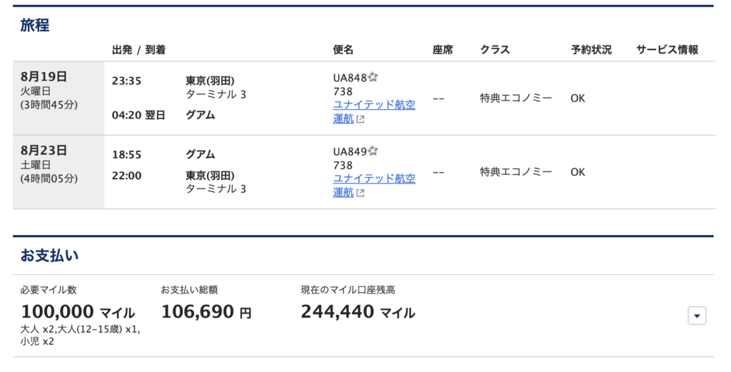 ユナイテッド航空は ANA と同じスターアライアンスに含まれる航空会社なので、ANA のマイルを使用して家族5人分発券しました。