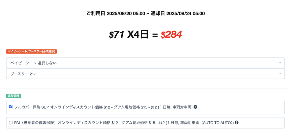レンタカー会社は Hertz とか有名どころもあるんですが、一番値段が安そうだったので日産レンタカーにしました。日産レンタカーから直でも予約できるんですが、グアムの代理店になっている iGUAM から予約する方が安いし、なんなら WiFi まで無料で付けてくれるので、予約する際はこちら iGUAM からやってみてください。