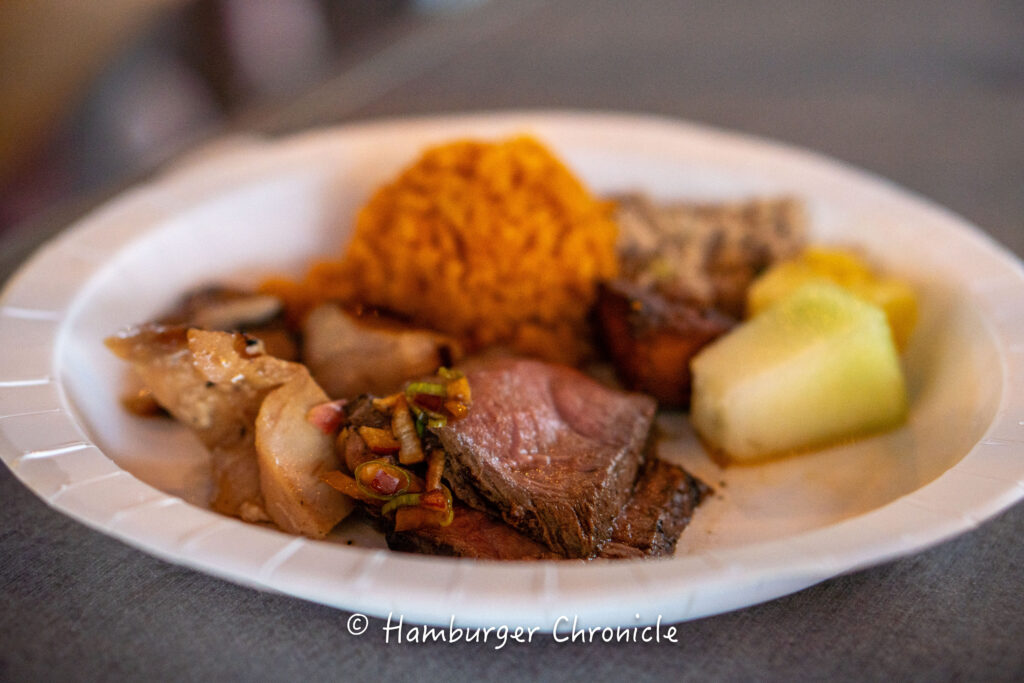 料理はチャモロ料理なので、昨日のナイトマーケットで買ってきたお弁当と同じような感じですが、こっちは丁寧に作られているのでお上品な仕上がりでございました。