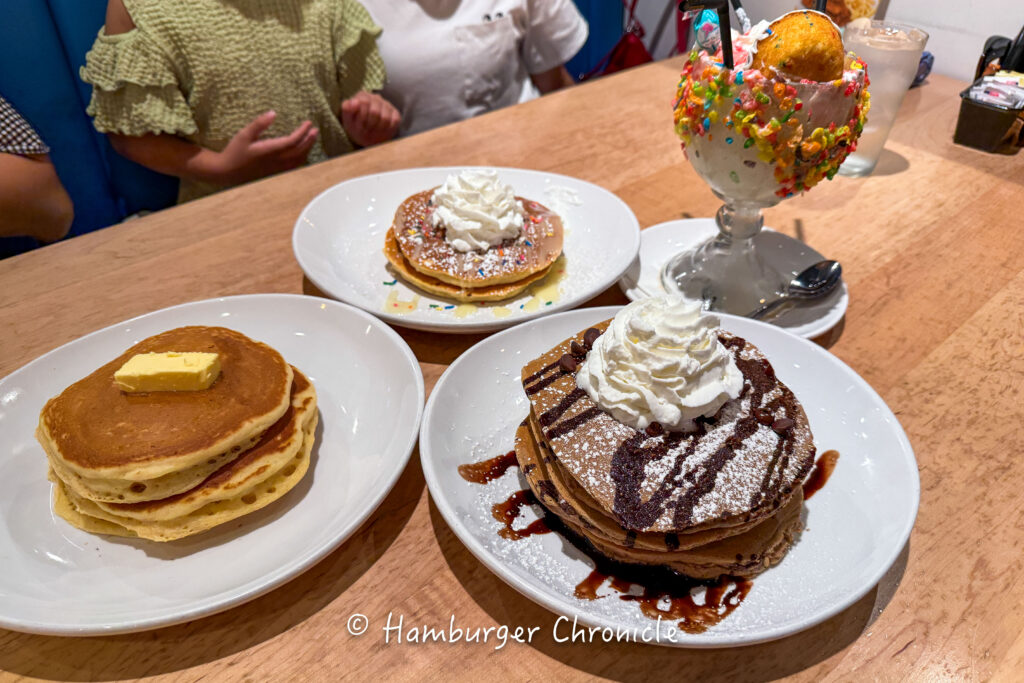 IHOP はパンケーキもいろいろ置いてあるのですが、ハンバーガーや、トースト/ベーコン/目玉焼きセットみたいな朝食メニューみたいなのもあるので、甘い物が苦手なお父さんでも入りやすいと思います。