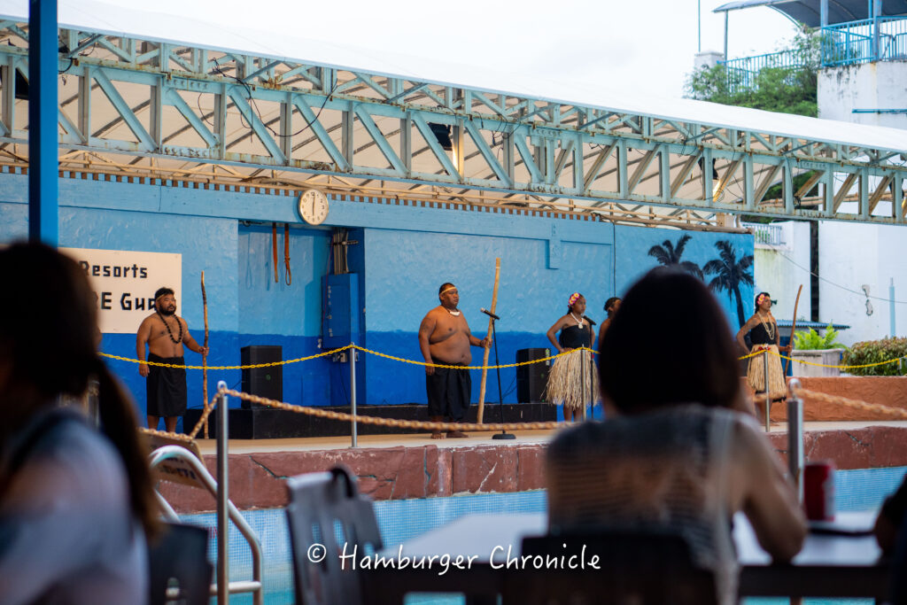 波のプールの両サイドにテーブル席が用意されていて、好きなところに座ります。ビールかアイスティーをもらって座席へ。最初はグアムの先住民のチャモロの儀式?みたいな、歌とダンスを鑑賞します。ちょっと音声が聞き取れなくてなんだったのか結局わからないままでした。