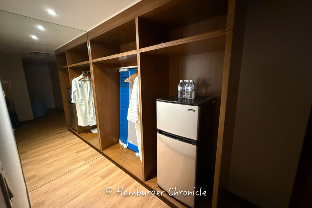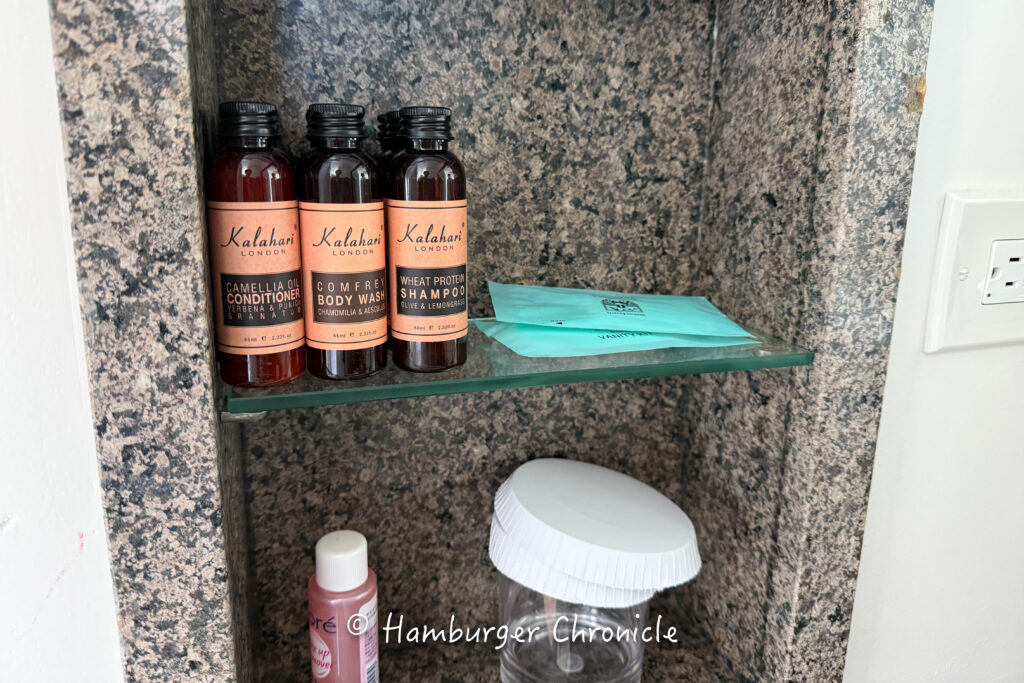 他の方のレビューを見ると、アメニティ類はフロント横から持って行くスタイルという記事もいくつか見かけたんですが、僕たちが宿泊した際は部屋に置いてあり、フロント横には特に用意されていませんでした。