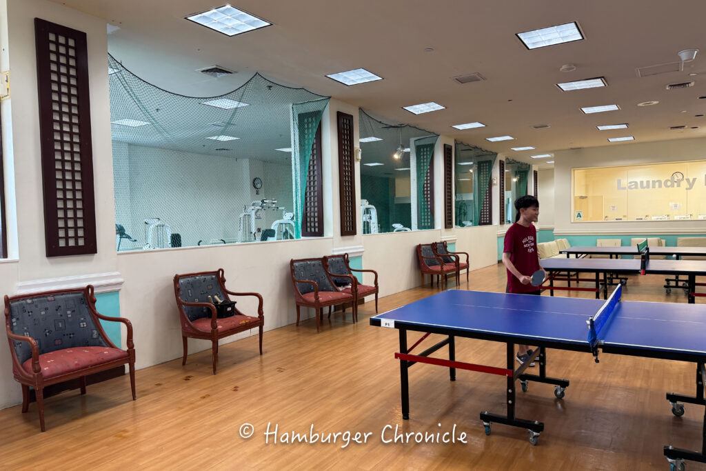 卓球台は3台で、フロントでラケットとボールを借りる感じでした。1回15分とかだったかな?ちょっと短めですけど、無料で利用できて、3つとも使われている時間がほとんどでした。僕たちが入ったときもちょうど3つ使われていたので、フロントの方が、「ウェイティングリストに入れておくから、19:45になったらまた来てね」みたいな感じで案内してくれました。